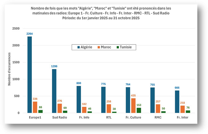 Autre constatation édifiante : puisque l'étude s'étend du 1er janvier au 31 octobre 2025, c'est-à-dire durant 304 jours, le mot « Algérie » a été cité, en moyenne, pas moins de 80 fois par jour par les quatre chaînes d'information en continu ! En comparaison, ces moyennes sont de 12 pour le Maroc et de moins de 5 pour la Tunisie.