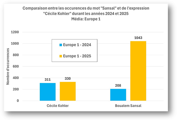 Graphique 16 : Comparaison entre les occurrences du mot « Sansal » et de l'expression « Cécile Kohler » durant les années 2024 et 2025. Média: Europe 1 (Matinale)