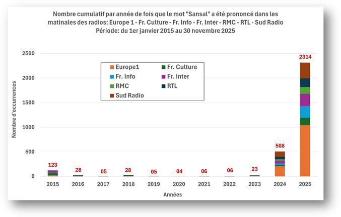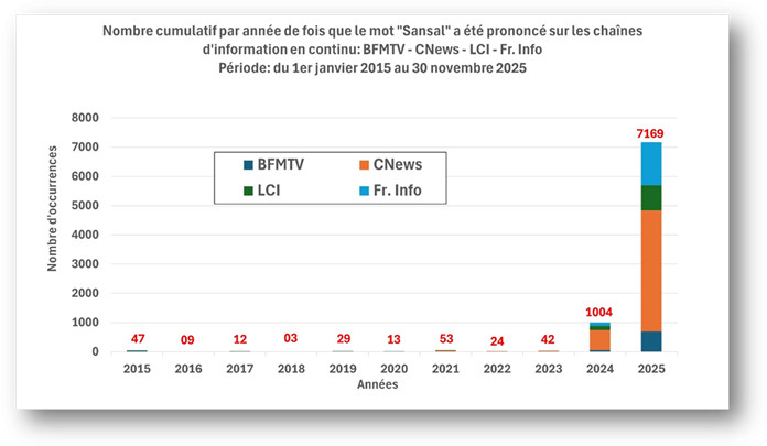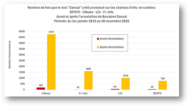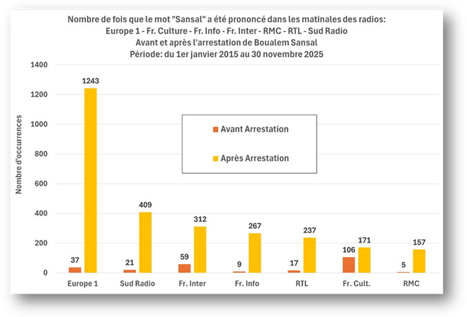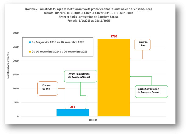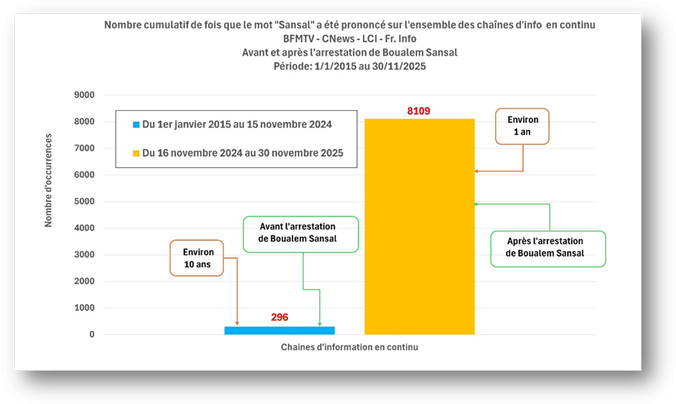 Finalement, si on tient compte de tous les médias utilisés dans ce travail (chaînes d'information en continu et radios), le nom de Sansal aura été prononcé 10905 fois durant les onze premiers mois de 2025 contre 550 fois les dix années précédentes!