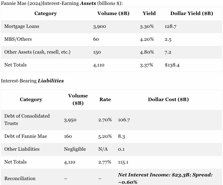 Stated differently, pretax profit would have been about $42 billion in 2024, representing a 57 basis points against the $7.4 trillion of assets. On the other hand, without Uncle Sam's sovereign credit rating Freddie and Fannie would easily pay 50 to 100 basis points more than the 2.90% they paid on its interest-bearing liabilities in 2024.