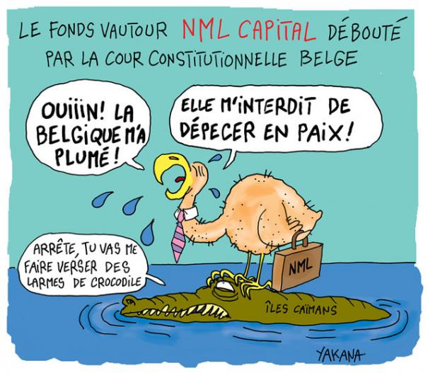 Après le dur combat du CADTM, CNCD et 11.11.11 pour protéger la loi belge contre les fonds vautours attaquée par NLM capital, un fonds vautour états-unien, Yakana trouvait le coup de crayon parfait pour illustrer notre belle victoire.