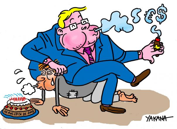 | « Un souvenir que j'aimerais partager avec vous c'est ce dessin de Yakana au moment de ByeByeTina et des 10 ans de la crise financière. Une caricature drôle et acide comme il les faisait. » Aline |