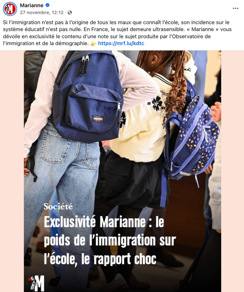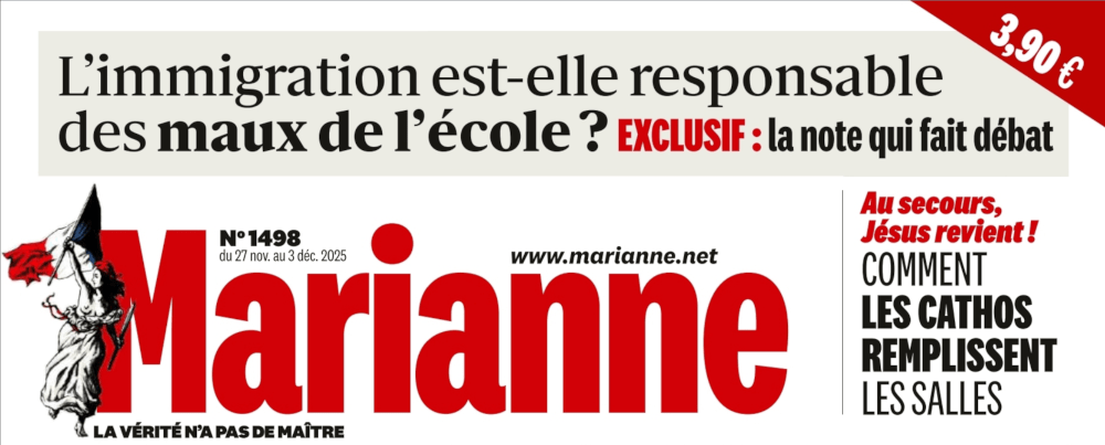Marianne ouvre le ban le 27 novembre et annonce la couleur en couverture. Posant une question toute en nuance - «L'immigration est-elle responsable des maux de l'école ?» -, le bandeau de l'hebdo fait dans le sensationnalisme : le «débat» est «exclusif» et fondé sur une «note» visiblement sulfureuse. La manière d'aguicher le lecteur est bien rodée : sous prétexte de simplement poser une question, il s'agit non seulement de décréter «ce qui fait débat» de manière performative et d'en légitimer les termes très discutables, mais aussi... d'en suggérer la réponse.