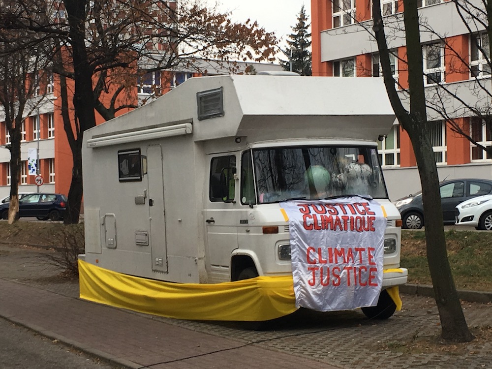 Je grimpe dans un bus électrique siglé COP24 puis flâne un peu dans les rues pour prendre mes premières marques. A part quelques oriflammes bleu ou vert accrochés aux lampadaires, peu de choses indiquent que Katowice est devenue pour quinze jours la capitale mondiale de la lutte contre le changement climatique... Mais soudain, au détour d'une rue déserte qui jouxte l'université, je tombe nez à nez avec un camping-car qui vient me rassurer : il est comme enrubanné dans une immense banderole appelant à la « Justice climatique ». Cette fois, nous y sommes.