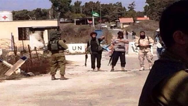 Cette photographie datant de 2015 montre une des rencontres régulières réunissant des combattants de Daech et de l'ex Al-Qaeda avec des soldats des forces de défense israélienne (IDF) à un checkpoint déserté de la Force des Nations Unies Chargée d'Observer le Désengagement (FNUOD ou UNDOF).