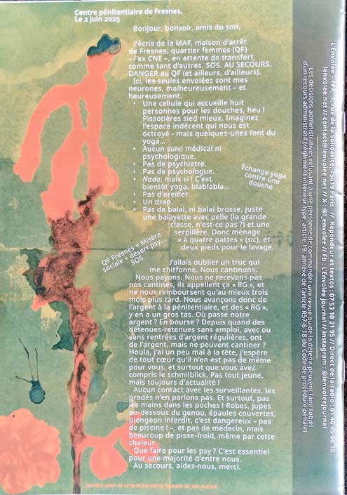 « L'Envolée » est une émission de radio et un journal militant français créés pour donner la parole aux prisonniers, prisonnières, et leurs proches, et pour maintenir un dialogue entre l'intérieur et l'extérieur des prisons. C'est un espace d'expression qui permet aux personnes enfermées de témoigner de leurs conditions de détention, dénoncer les violences qu'ils subissent, et critiquer le système carcéral et judiciaire dans son ensemble. L'Envolée se présente comme un porte-voix contre l'enfermement et vise à mettre en lumière la réalité carcérale souvent invisibilisée par l'administration pénitentiaire et les médias officiels. Elle défend un point de vue abolitionniste, dénonçant la prison comme un outil de contrôle social et d'enfermement de la misère.