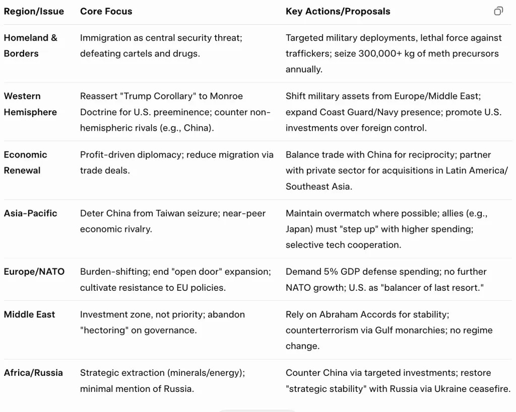 - De gendarme mondial à hégémon régional : contrairement à la Stratégie de sécurité nationale (NSS) de Biden de 2022 (qui mettait l'accent sur les alliances et la concurrence entre grandes puissances) ou à celle de Trump de 2017 (où la Chine et la Russie étaient qualifiées de révisionnistes), ce document met fin aux "fardeaux éternels" des États-Unis à l'étranger. Il donne la priorité aux Amériques par rapport à l'Eurasie, considérant l'Europe et le Moyen-Orient comme des secteurs moins prioritaires.
