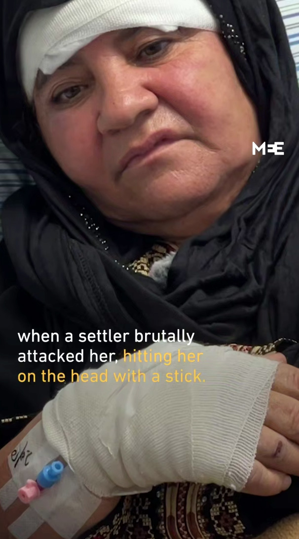 Assise sur un lit d'hôpital, des bandages autour du bras et de la tête,  Afaf Saleh Abu Alia raconte amèrement le moment où des colons israéliens l'ont violemment battue alors qu'elle et sa famille cueillaient des olives à Turmus Ayya dimanche.