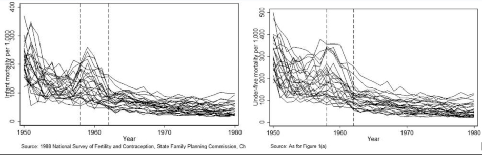 Une autre source intéressante de données à examiner sont les données détaillées sur la mortalité provinciale recueillies dans le cadre de l'Enquête nationale sur la fécondité de 1988 (publiées dans  cette étude universitaire de l'Université de Stanford sur la baisse de la mortalité en Chine sous Mao), qui montrent que les taux de mortalité des nourrissons et des enfants de moins de cinq ans ont légèrement augmenté pendant le Grand Bond en avant, mais étaient constamment inférieurs tout au long de la période par rapport à ce qu'ils avaient été au début des années 1950 (voir les graphiques ci-dessous extraits de l'étude).