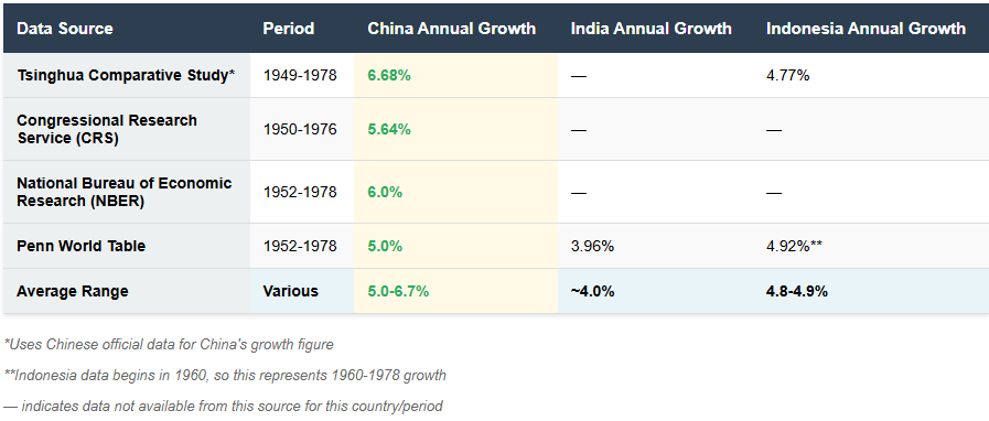 Les données sont globalement claires : pendant l'ère Mao, la Chine a surperformé ses deux pairs les plus comparables. Son économié a augmenté environ 25% plus vite chaque année que l'Inde (5-6, 7% contre ~4%) et modestement plus vite que l'Indonésie (5-6, 7% contre 4,8-4,9%). Ce qui signifie que quelles que soient les critiques que l'on puisse faire de la politique de Mao, le récit occidental répandu selon lequel il a présidé à une "catastrophe économique" est manifestement faux. La réalité, confirmée par les institutions de recherche américaines, les bases de données internationales et les études comparatives, est que Mao a présidé à une expansion économique significative qui a dépassé celle de nations comparables.
