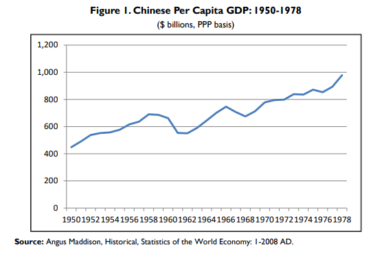 Un chiffre pour vous : sous Mao, le PIB en PPA par habitant (c'est-à-dire par personne) de la Chine a été multiplié par environ 2,5 fois, passant d'un peu plus de 400 dollars au début des années 1950 à près de 1 000 dollars en 1978. Ces chiffres ne proviennent pas d'une "source communiste", ils sont tirés directement d'un rapport du Congressional Research Service, la branche de recherche du Congrès américain.