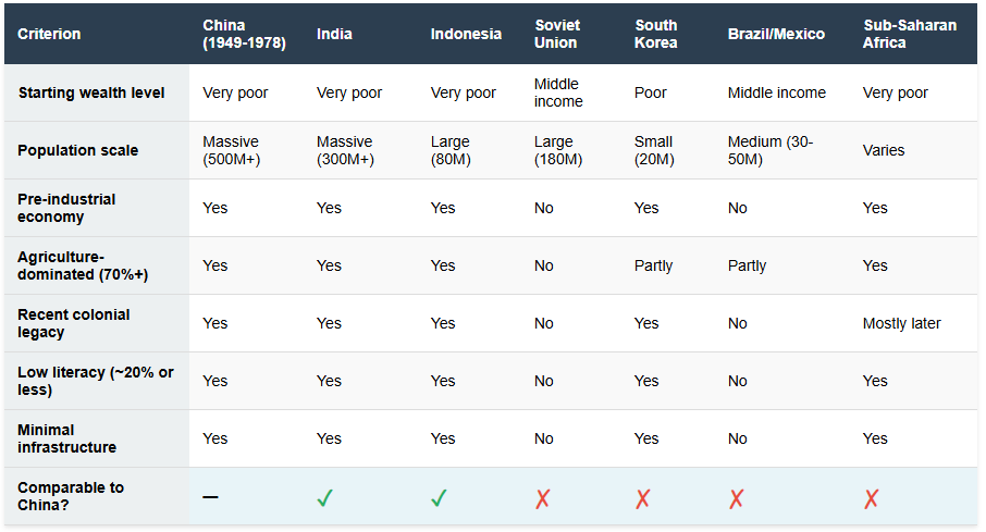 Si vous regardez le tableau ci-dessus, il est assez évident que les 2 pays les plus comparables sont l'Inde et l'Indonésie : ils partageaient l'extrême pauvreté, la structure économique préindustrielle, le faible taux d'alphabétisation et l'héritage colonial de la Chine, tout en ayant des populations suffisamment importantes pour faire face à des défis de développement similaires.