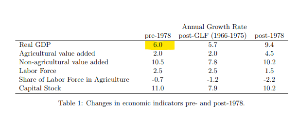 Ceci est à peu près cohérent avec  les propres données officielles de la Chine qui indiquent que l'économie a progressé de 6,68% avant 1978.