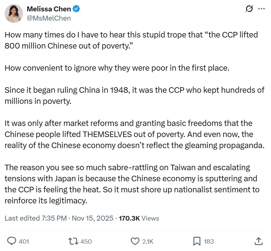 Pourquoi ? Parce que c'est l'un des plus grands malentendus sur le développement de la Chine, que je rencontre tout le temps (exemple récent dans le tweet ci - dessous): la croyance qu'il a rendu - ou maintenu - la Chine pauvre, et que ce n'est qu'après que la libéralisation a donné aux Chinois la liberté de s'engager dans une activité de marché que la Chine a connu une croissance économique, malgré le Parti communiste plutôt que grâce à lui. Le Parti n'aurait que le mérite de s'être écarter, si c'est le cas. C'est un cadre qui traite la "liberté" et les "marchés" comme des mots magiques expliquant tout.