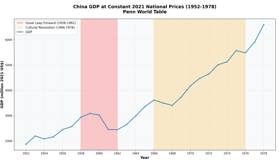 Une quatrième source de données que nous pourrions également ajouter est la Penn World Table, produite par des économistes de l'Université de Groningue et de l'Université de Californie, une base de données permettant de comparer la production économique entre les pays et le temps.  Leurs données montrent que le PIB réel de la Chine a commencé à un faible PIB de 187 milliards de dollars en 1952 (aux prix nationaux constants de 2021) et s'est terminé à 659 milliards de dollars en 1978, soit une croissance de 3,52 fois, ce qui se traduit par une croissance annuelle d'environ 5%.