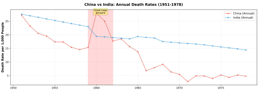 Il est également intéressant d'examiner la comparaison avec le pair le plus comparable de la Chine, l'Inde, pendant la période Mao (voir le graphique ci-dessous) : alors que les taux de mortalité de la Chine  ont dépassé brièvement ceux de l'Inde en 1960-1961, la Chine a maintenu des taux de mortalité nettement inférieurs à ceux de l'Inde tout au long du reste de l'ère Mao. Au milieu des années 1960, l'avantage du taux de mortalité de la Chine par rapport à l'Inde était de 10 à 12 pour mille, un écart qui a persisté jusqu'à la mort de Mao en 1976. Quels que soient les échecs du Grand Bond en avant, la trajectoire globale de la santé publique de la Chine sous l'ère Mao a constamment surpassé ses pairs les plus comparables.