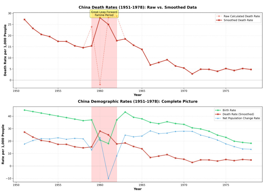 Nous ne devons pas ignorer le bilan humain que le Grand Bond en avant a infligé. Cela reste les échecs politiques les plus graves de l'histoire chinoise moderne, provoquant une véritable surmortalité et des souffrances généralisées. Mais il ne faut pas non plus exagérer la catastrophe : la meilleure façon d'évaluer les taux de mortalité pendant le Grand Bond en avant est probablement de regarder  les chiffres de la population et de les réconcilier avec  les données sur le taux de natalité (qui est passé de 37 pour mille en 1959 à seulement 21 pour mille en 1960 - moins de bouches à nourrir pendant les épreuves, comme on pouvait s'y attendre), afin d'avoir une estimation de ce que les taux de mortalité ont dû être pour produire les changements démographiques observés.