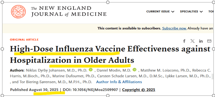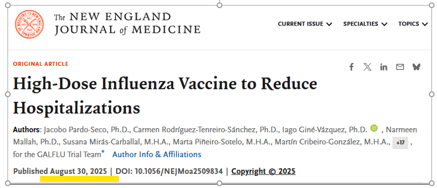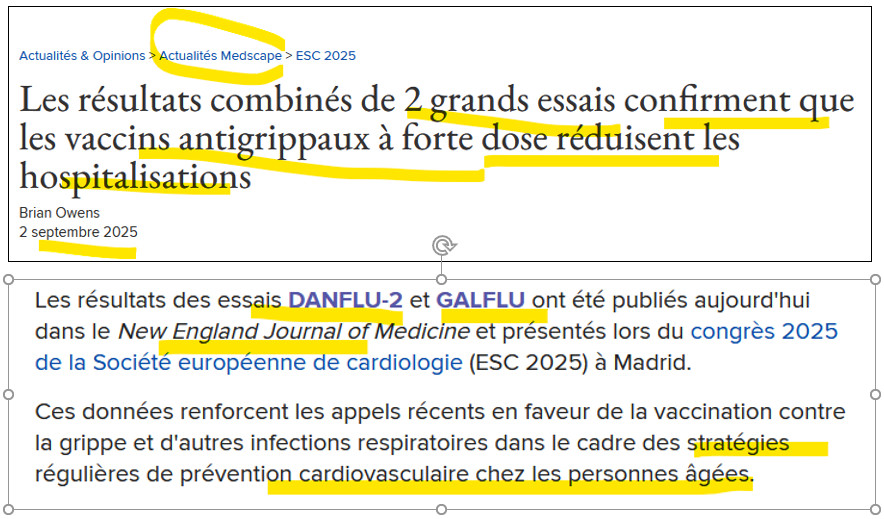 Les autorités et les experts (de nationalités variées) nous annoncent qu'il est urgent en cet octobre 2025 de se vacciner contre la grippe, surtout les séniors qui sont, comme chacun sait, à très haut risque de mourir de la grippe.