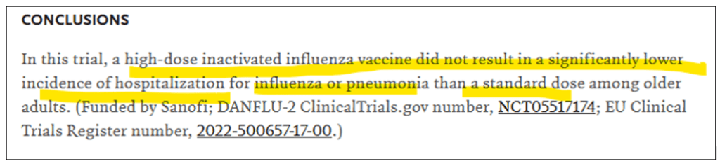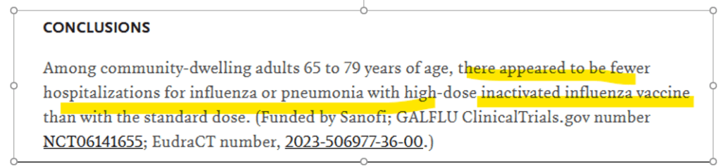 Conclusion en français : l'étude est complètement négative ! Les vaccins hautement dosés ne sont pas plus efficaces que leurs prédécesseurs qui eux-mêmes ne l'étaient pas.