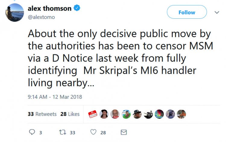 Aujourd'hui, l'ancien ambassadeur britannique Craig Murray dit que Clive Ponting, un autre ex-haut fonctionnaire  soupçonne le gouvernement britannique d'avoir émis une D-Notice*. Il s'agit d'une interdiction faite aux médias britanniques de rendre compte d'une question donnée. Murray fait également référence à un tweet du correspondant de Channel 4 Alex Thomson du  12 mars, dans lequel Thomsen mentionne une D-Notice interdisant à MSM de nommer l'agent du MI-6 qui était le contact de M. Skripal :