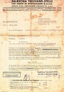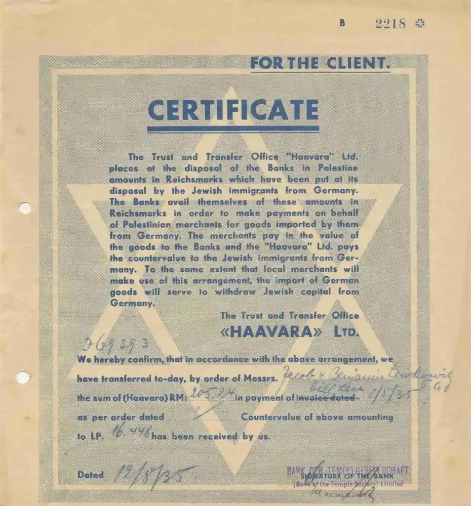 L'accord de transfert de la société Hanotea utilisé par le Palästina Treuhandstelle (Bureau fiduciaire palestinien), créé spécifiquement pour aider les juifs fuyant le régime nazi à récupérer une partie des biens qu'ils avaient été contraints d'abandonner lorsqu'ils ont fui l'Allemagne nazie.