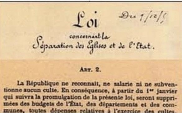 La loi de 1905, dite de Séparation des Églises et de l'État, assure la liberté et la paix civile. La France qui a connu les guerres de religion, les discriminations - (Alfred Dreyfus n'est réhabilité qu'en 1906 !) - répond par cette loi qui en République assure la liberté de conscience et garantit le libre exercice des cultes, par la Séparation des Églises et de l'État. La loi commune découle de la volonté générale du peuple ; les valeurs morales restent du domaine de la conscience privée.