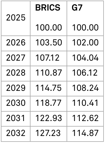 Cela se traduirait par une augmentation de 27% du PIB des pays BRICS et de seulement 14% pour celui du G7. Cependant, cet exercice chiffré n'a pour but que d'illustrer le dynamisme supérieur des pays BRICS, car une telle extrapolation de la croissance économique suppose que la composition du BRICS restera inchangée jusqu'en 2032 et que la dynamique globale du développement économique ne changera pas, ce que je considère comme hautement improbable.