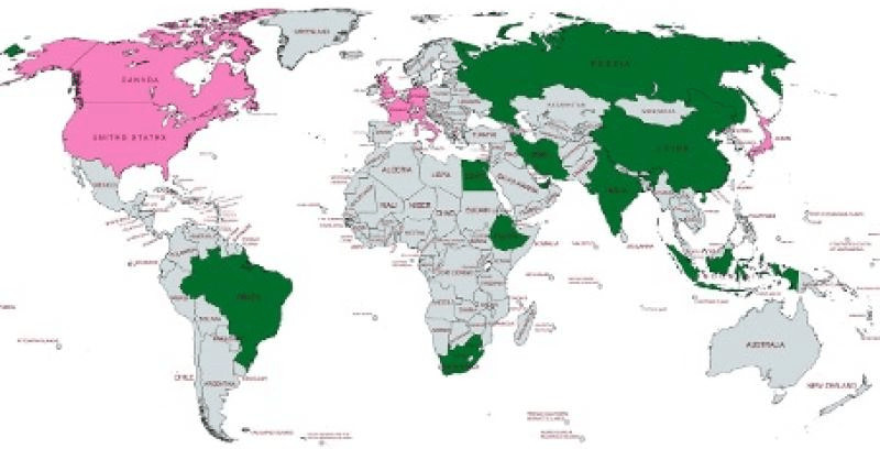 Membres du G7 - rose ; membres du BRICS - vert - source : ForumGeopolitica.