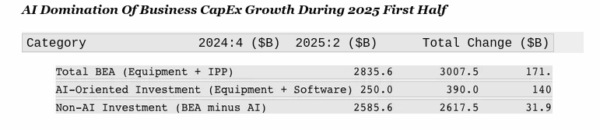 Of course, when you back out this AI investment explosion from the overall US investment spending numbers, what's left is pretty punk. To wit, non-AI investment in US equipment and intellectual property in the fourth quarter of 2024 totaled $2.586 trillion, which figure rose by only $31.9 billion as of Q2 2025. So the annualized rate of gain was just 2.4% during the 2025 first half-a level far below the 12.2% annual gain in the AI-swollen BEA figure for total US equipment and intellectual property (first line) investment.