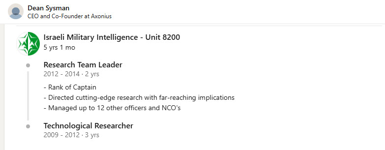 Axonius was founded and is currently run by Israelis Dean Sysman, Ofri Shur and Avidor Bartov, who met in the 2010s  while working on the same team within Israel's Unit 8200 spy service. On his LinkedIn profile, Sysman offers few details of their work for the IDF, describing it simply as having 'far-reaching implications.'