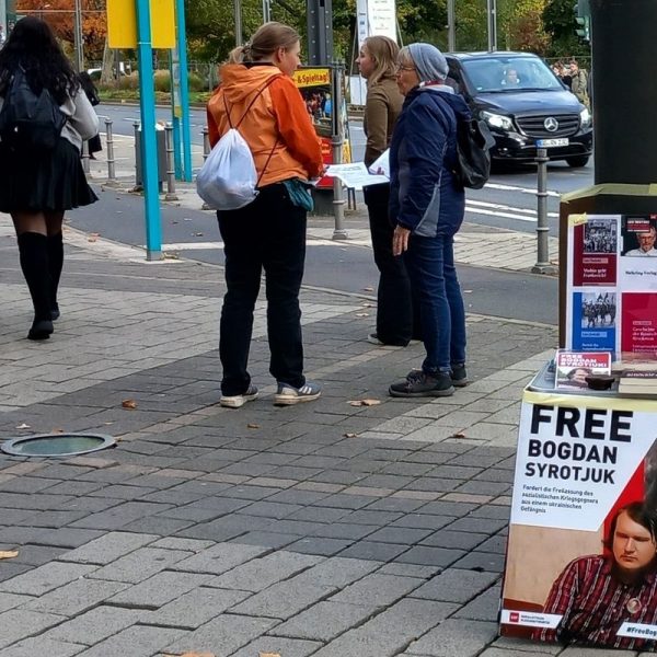The WSWS team had previously drawn attention to the case of the imprisoned Ukrainian socialist and anti-war activist Bogdan Syrotiuk with posters outside the book fair and distributed an article criticising the awarding of the "Peace Prize" to the warmonger Schlögel.