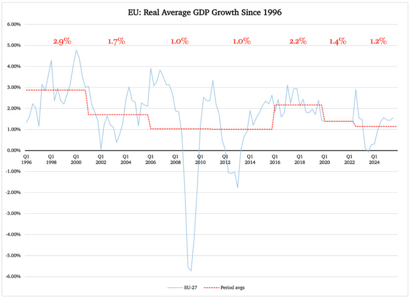 To date, Eurostat has published numbers for gross domestic product and its components through the third quarter of 2025. If we calculate an average for those three quarters, the GDP of the EU itself has grown at 1.48% over the same three quarters in 2024. The euro zone is doing even worse: 1.35%.