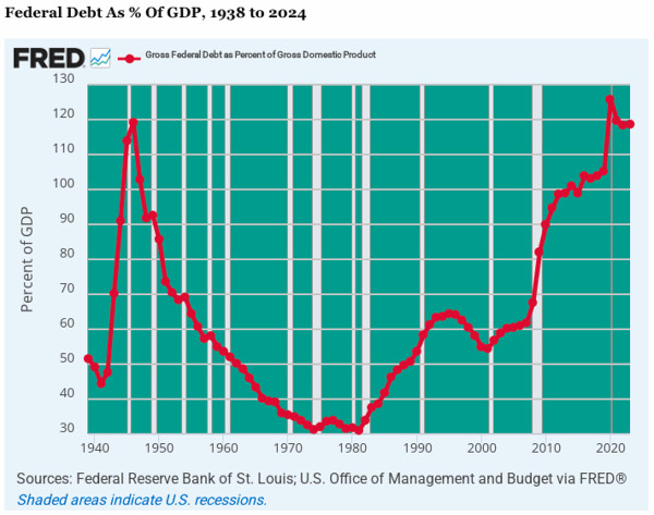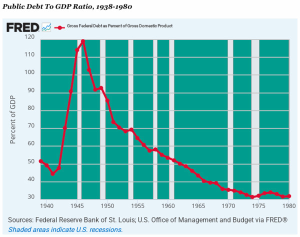 In fact, when the GOP-Dixiecrat coalition put an end to the New Deal in 1938, the public debt stood at 52% of GDP - before the exigencies of WWII sent the ratio soaring to a peak of 120% of GDP in 1946.