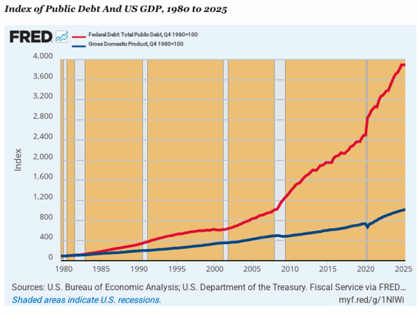 Yet that's the sum and substance of America's fiscal path since 1980. In the graph below, both variables are indexed to the levels of Q4 1980-so the ever-widening gap between the public debt (red line) and the US economy's capacity (blue line) to carry it is unmistakable.