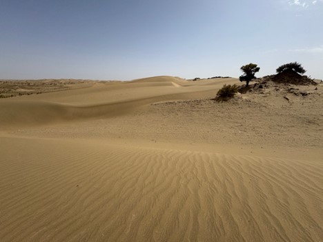 Cruzamos el Taklamakan desde la Ruta de la Seda del Norte en Aksu hasta la del Sur, cerca de Keriya, y experimentamos de todo, desde la impecable autopista bordeada por los juncos que componen el "cubo mágico de China" -para mantener alejada la arena- hasta algunos de los 3046 km de cinturón verde que bloquea la arena, con plantas como el álamo del desierto y el sauce rojo.