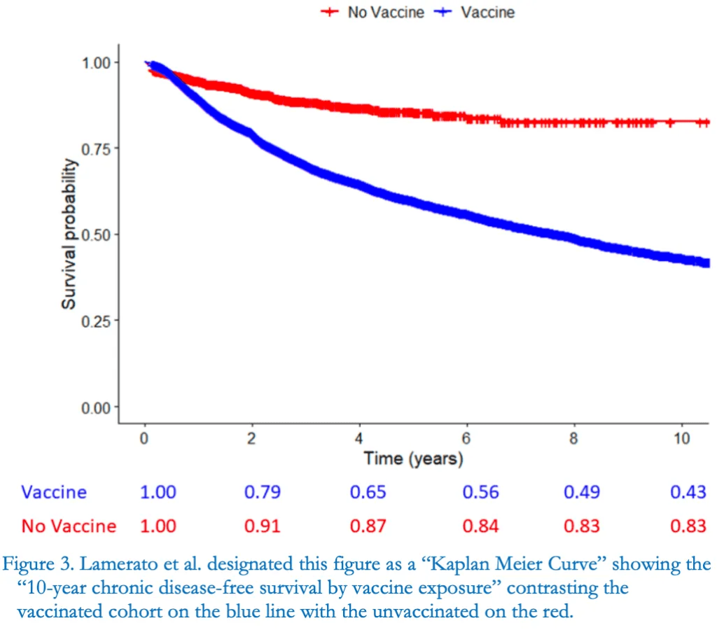 Notre réanalyse du tableau 2 de Lamerato et al. a révélé que les 22 catégories de maladies chroniques survenaient proportionnellement plus fréquemment chez les enfants vaccinés, avec de nombreuses maladies dont la fréquence était multipliée par 10 à 20.