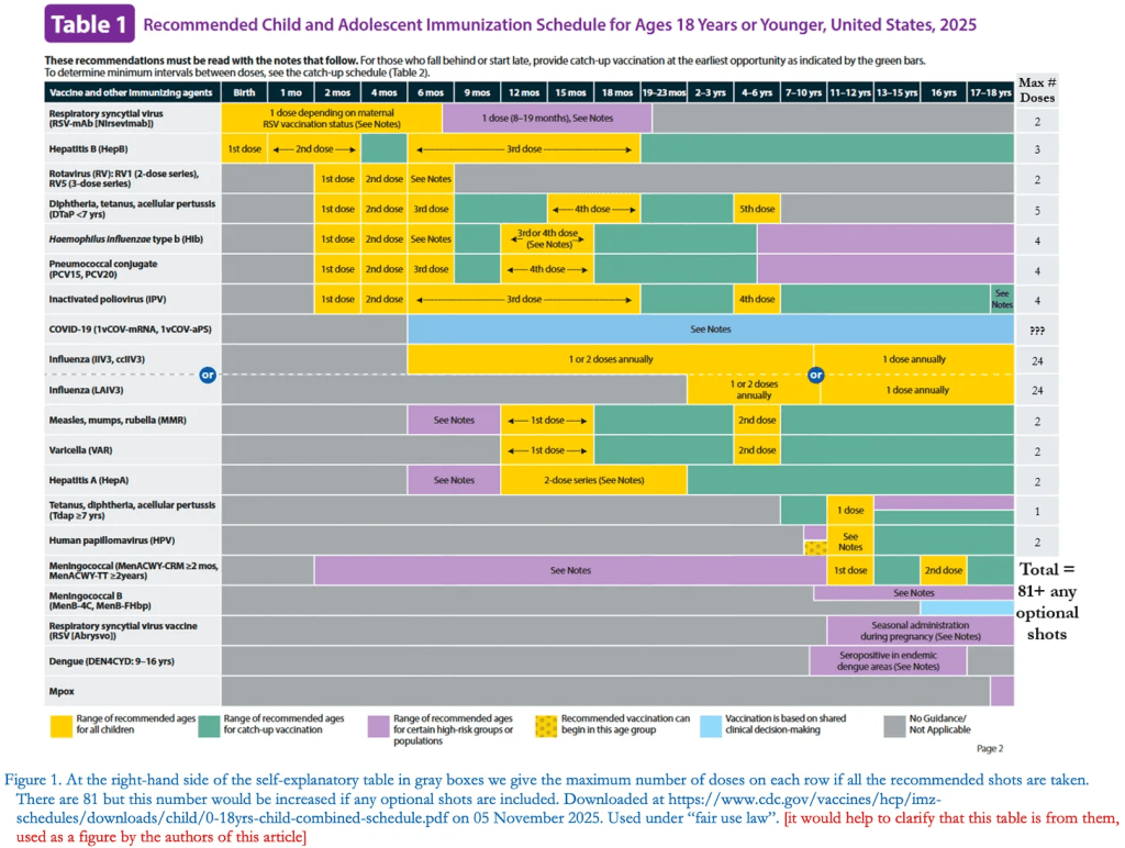 À titre de comparaison, nous avons calculé que le calendrier vaccinal infantile actuel des CDC prévoit au moins 81 doses de vaccin avant l'âge de 18 ans, soit plus de quatre fois l'exposition médiane observée dans la cohorte Henry Ford.
