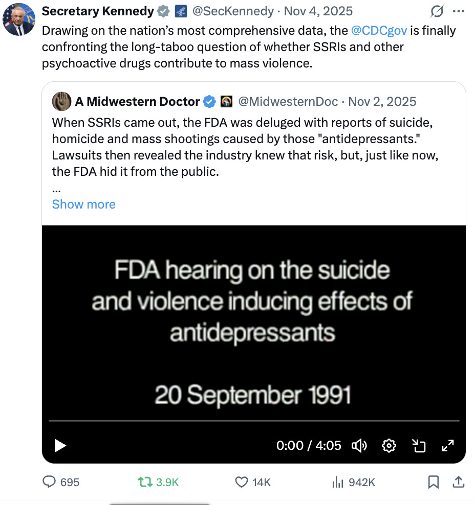 Note: initially, there were many news reports which disclosed school shooters were on SSRIs, but once this was noticed, the media largely stopped reporting what medications shooters were on. I recently learned through a CDC employee that the CDC continued to privately track this and found the link persisted, but did not disclose it due to the political ramifications of doing so—hence illustrating why Kennedy's recent statement is so extraordinary.