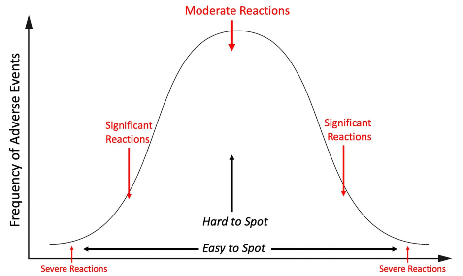 In toxicology, you will typically see severe and extreme reactions occur much less frequently than moderate reactions:
