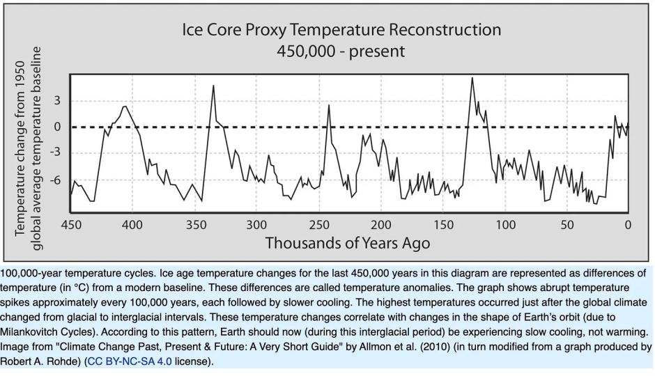 Nevertheless, from various natural phenomena such as tree rings, arctic ice core samples, radiocarbon dating of fossilized trees and plants, and the deposition of rocks and sediments from glaciers, scientists have determined that the earth's has greatly fluctuated over time, with fairly regular periods of glaciation and inter-glaciation, as illustrated on this chart: