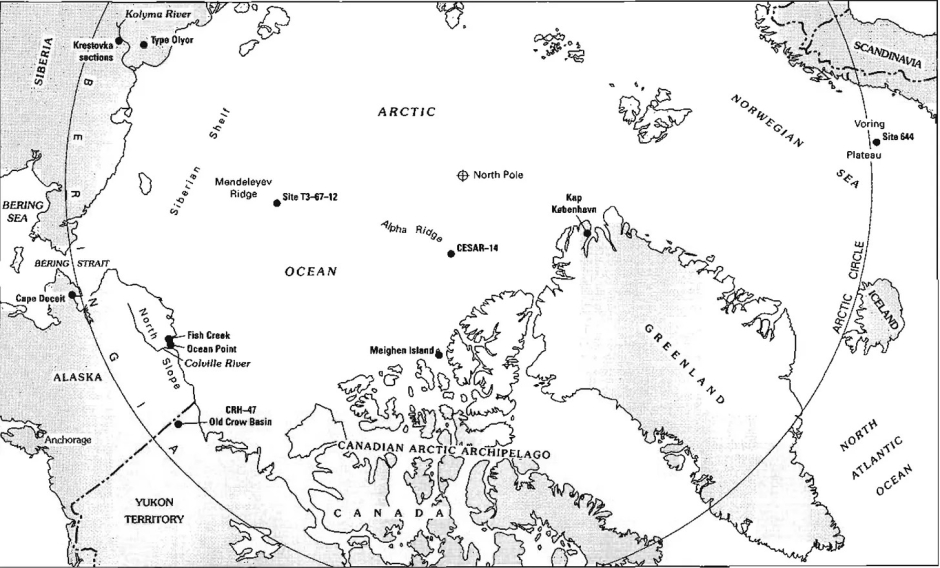 At the beginning of the first cooling cycle, forests, dominated by mixed conifers and including minor but moderately diverse deciduous broadleaf trees, bordered a warm-subfrigid Arctic Ocean. Treeline at lat 79'39' N. indicated an arctic climate remarkably warm by comparison with today's conditions but not so warm as the climate at the beginning of the second cooling cycle. Two successive terrestrial records in Siberian Beringia, four separate but sequential marginal-marine records in Alaskan Beringia and northern Canada, and core records from the Arctic Ocean indicate that between 3.0 and 2.4 million years ago the Arctic Ocean Borderland progressively changed to a conifer forest-tundra ecosystem, then to fully developed tundra. With these floral changes came the first record of permafrost and a frigid Arctic Ocean.
