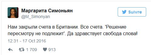 «Tous nos comptes bancaires ont été bloqués au Royaume-Uni. Tous. « La décision est unilatérale ». Vive la liberté d'expression !», avait alors tweeté la rédactrice en chef de RT, Margarita Simonyan.