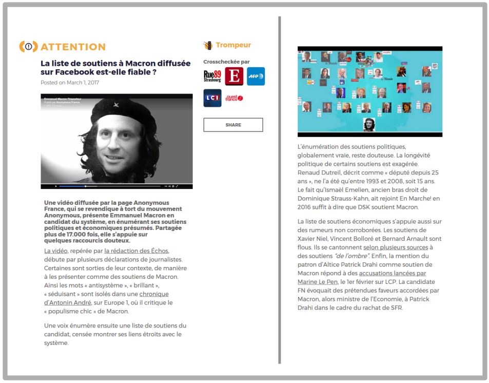 « L'énumération des soutiens politiques, globalement vraie, reste douteuse. La longévité politique de certains soutiens est exagérée. Renaud Dutreil, décrit comme « député depuis 25 ans », ne l'a été qu'entre 1993 et 2008, soit 15 ans. Le fait qu'Ismaël Emelien, ancien bras droit de Dominique Strauss-Kahn, ait rejoint En Marche! en 2016 suffit à dire que DSK soutient Macron.La liste de soutiens économiques s'appuie aussi sur des rumeurs non corroborées. Les soutiens de Xavier Niel, Vincent Bolloré et Bernard Arnault sont flous. [..]. »