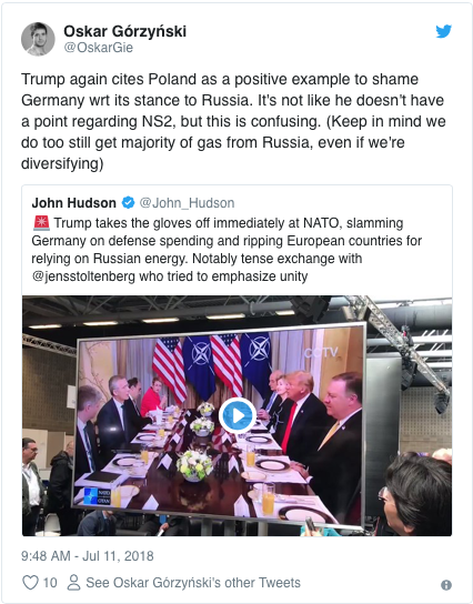 [Trump cite à nouveau la Pologne comme un bon exemple pour faire honte à l'Allemagne de sa position vis-à-vis de la Russie. Ce n'est pas comme s'il n'avait pas raison au sujet de NS2, mais c'est déroutant. (Gardez à l'esprit que nous recevons encore la majorité du gaz de Russie, même si nous nous diversifions) 1016947262117691393...]