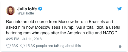 [J'ai rencontré une ancienne source de Moscou ici à Bruxelles et je lui ai demandé comment Moscou voit Trump. « Comme un idiot, un bélier politique utile qui s'en prend à l'élite américaine et à l'OTAN ».]