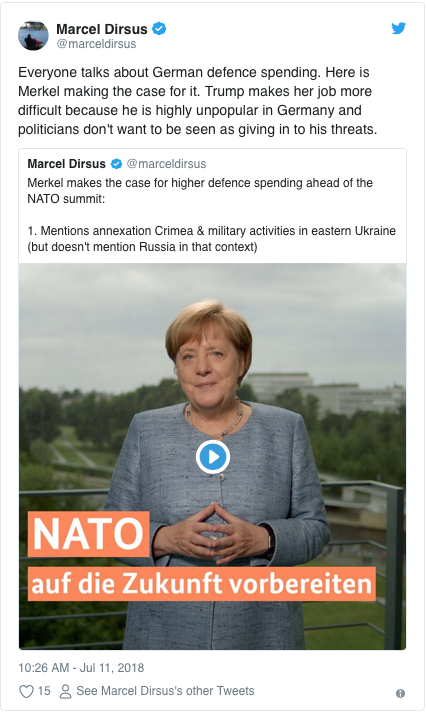 [Tout le monde parle des dépenses de défense allemandes. Voici les arguments de Merkel en sa faveur. Trump rend son travail plus difficile parce qu'il est très impopulaire en Allemagne et que les politiciens ne veulent pas être perçus comme cédant à ses menaces. 1015513506072887296...]