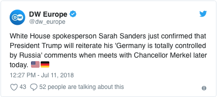 [La porte-parole de la Maison-Blanche, Sarah Sanders, vient de confirmer que le président Trump réaffirmera que l'Allemagne est totalement contrôlée par les propos de la Russie lors de sa rencontre avec la chancelière Merkel plus tard dans la journée.]