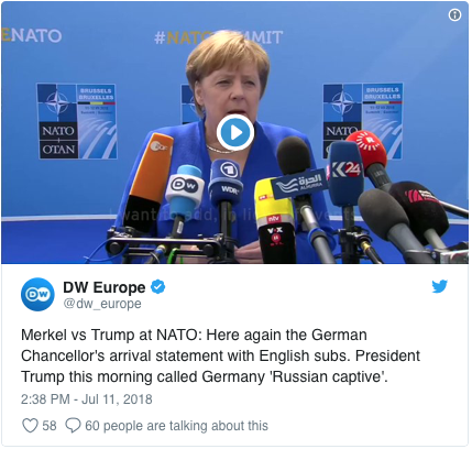 [Merkel face à Trump à l'OTAN : Ici encore, la déclaration d'arrivée de la chancelière allemande avec des sous-titres en anglais. Ce matin, le président Trump a qualifié l'Allemagne de « prisonnière des Russes ».]