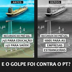 « Et vous dites que le coup d'État a été contre le PT ? ». À gauche, « Avant : ressources du Pré-Sal ; 75% allouées à l'Éducation, 25% allouées au système de Santé ». À droite, « Après : ressources du Pré-Sal ; 100% alloués aux entreprises étrangères »