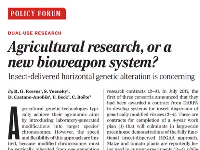 Cinq scientifiques de deux universités allemandes et d'une française le révèlent dans Science, une des plus prestigieuses revues scientifiques [1]. Dans leur éditorial publié le 5 octobre, ils mettent fortement en doute que le programme de recherche de la Darpa, intitulé « In-sectes alliés », ait uniquement le but déclaré par l'Agence : celui de protéger l'agriculture états-unienne des agents pathogènes, en utilisant des insectes comme vecteurs de virus infectieux gé-nétiquement modifiés qui, en se transmettant aux plantes, en modifient les chromosomes. Cette capacité soutiennent les cinq scientifiques apparaît « très limitée ».